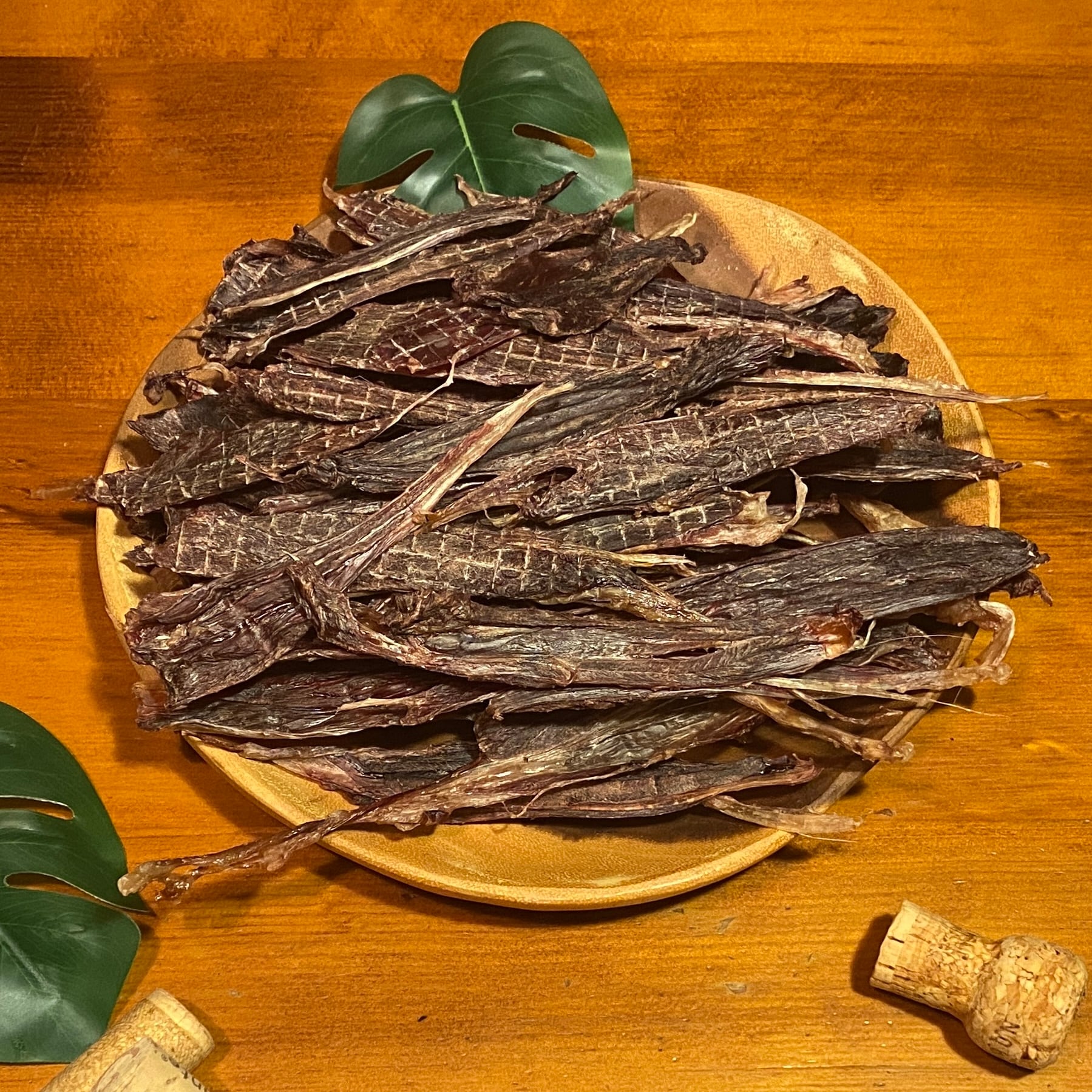 当店こだわりの鹿のスネ肉ジャーキーです。 後ろ足より踏み込む力が必要なため発達した、より筋肉が多くゼラチン質部分しか使用していませんので1頭からごくわずかしか取れない。鹿肉ジャーキーよりもハードな噛み応えがあり、顎の力を鍛えながら歯磨き効果も◎ 100gあたり約15〜20枚入っています。